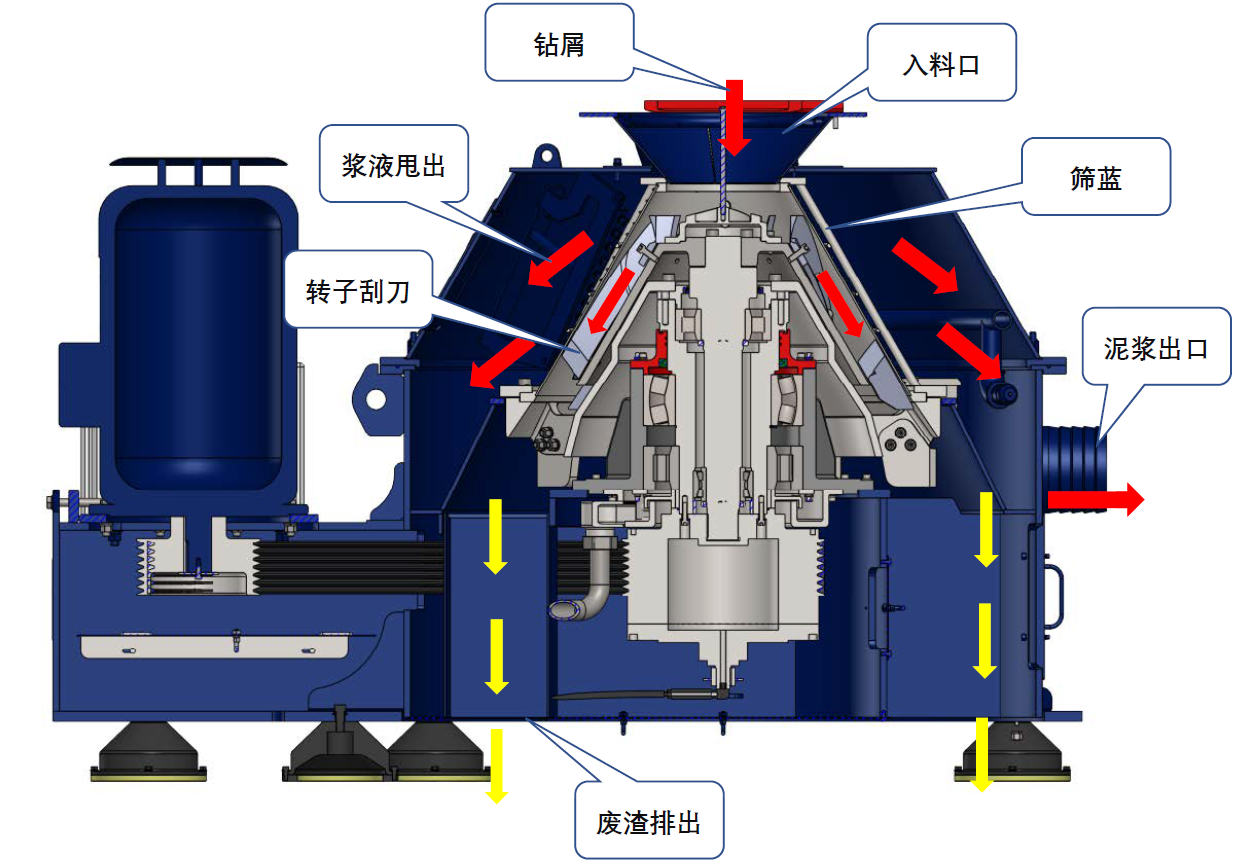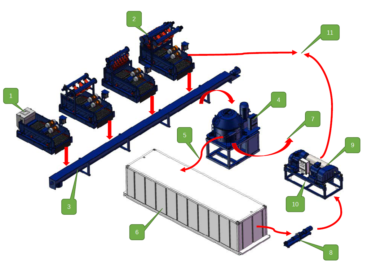 鉆屑干燥機(jī)是一種單級(jí)連續(xù)工作的立式刮刀卸料干燥離心機(jī),也叫立式干燥離心機(jī)和巖屑甩干機(jī),是石油鉆井廢棄物泥漿不落地處理系統(tǒng)的重要設(shè)備之一。鉆屑干燥機(jī)的轉(zhuǎn)鼓壁上有許多孔,轉(zhuǎn)鼓內(nèi)表面覆蓋過濾介質(zhì),加入轉(zhuǎn)鼓的懸浮液隨轉(zhuǎn)鼓一同旋轉(zhuǎn)產(chǎn)生巨大的離心壓力,在壓力作用下懸浮液中的液體流經(jīng)過濾介質(zhì)和轉(zhuǎn)鼓壁上的孔甩出,固體被截留在過濾介質(zhì)表面,從而實(shí)現(xiàn)固體與液體的分離。懸浮液在轉(zhuǎn)鼓中產(chǎn)生的離心力為重力的千百倍,使過濾過程得以強(qiáng)化,加快過濾速度,獲得含濕量較低的濾渣。 鉆屑干燥機(jī)主要用于油基泥漿環(huán)境下鉆井廢棄物的分離干燥,鉆屑干燥機(jī)處理完的鉆屑含油量通常小于5%。 BZGZ系列鉆屑干燥機(jī)技術(shù)參數(shù) 型號(hào) BZGZ900 BZGZ900-BP 處理量 30-50t/h 干燥效率 OOC≤5% 篩籃直徑 930mm 篩籃縫隙 0.25~0.5mm 轉(zhuǎn)速 900RPM 0-900RPM 分離因素 420G 0-420G 主電機(jī)功率 55kW 油泵電機(jī)功率 0.55kW 沖洗泵功率 3kW 防爆標(biāo)準(zhǔn) ExdIIBt4/IECEX/A-TEX 防爆柜類型 標(biāo)準(zhǔn)防爆柜 變頻防爆柜 重量 6000kg 外形尺寸 2645x1800x1880mm 北鉆鉆屑干燥機(jī)工作原理及工作流程 北鉆鉆屑干燥機(jī)工作流程說明如下∶ 鉆機(jī)過來的泥漿通過高架管匯進(jìn)入振動(dòng)篩(1)、泥漿清潔器(2),經(jīng)過(1)、(2)處理排放的鉆屑通過螺旋輸送器(3)輸送至鉆屑干燥機(jī)(4)處理。鉆屑干燥機(jī)處理完的固體通過廢渣(7)排出,回收到的鉆井泥漿(5)進(jìn)入鉆井液泥漿罐(6),離心機(jī)供液泵或者螺桿泵(8)抽取含有細(xì)固顆粒的回收泥漿,供給離心機(jī)(9)處理,固體部分通過固體排渣口(10)排出,處理完成的鉆井液通過干凈泥漿回歸泥漿系統(tǒng)(11)。 北鉆鉆屑干燥機(jī)的特點(diǎn)和優(yōu)勢(shì): 1.轉(zhuǎn)速可達(dá)900RPM,能夠形成420G的分離因素,有效分離鉆屑中的液體; 2.卸料刮刀由硬質(zhì)合金材質(zhì)制造而成,使用壽命長(zhǎng); 3.每個(gè)可更換的選擇部件都通過動(dòng)平衡測(cè)試,更換部件后的整機(jī)平衡性; 4.獨(dú)立的油路冷卻系統(tǒng),配備科學(xué)的油箱冷卻系統(tǒng),滿足高溫環(huán)境中的使用需求; 5.卸料口可以配備螺旋輸送機(jī),便于干燥鉆屑的輸送,和設(shè)備的連續(xù)作業(yè); 6.錐形頂蓋上設(shè)有觀察口,隨時(shí)可檢查篩網(wǎng)和螺旋刮刀的磨損情況。